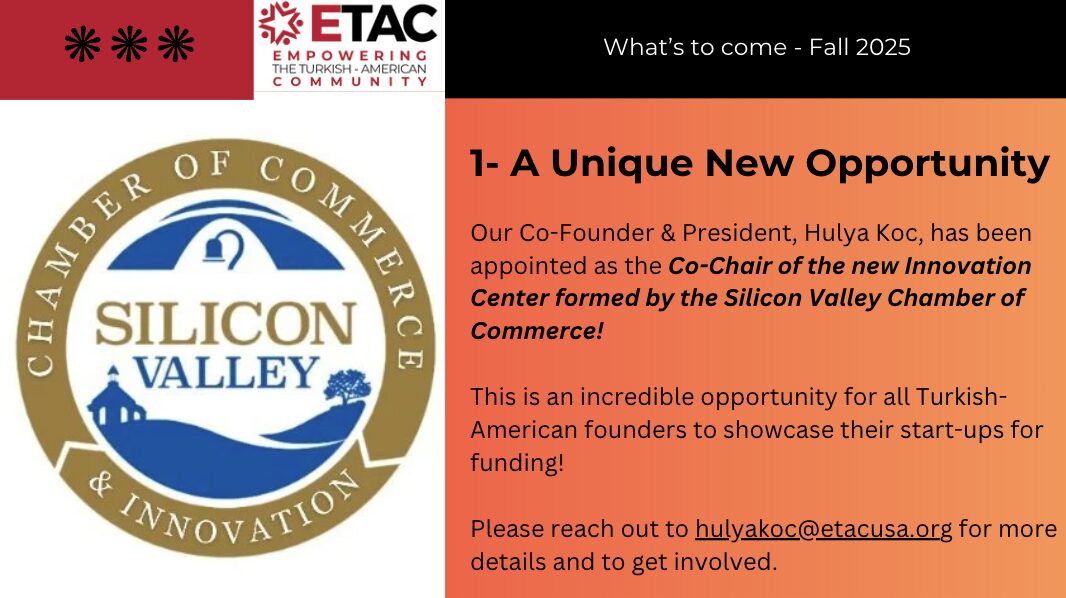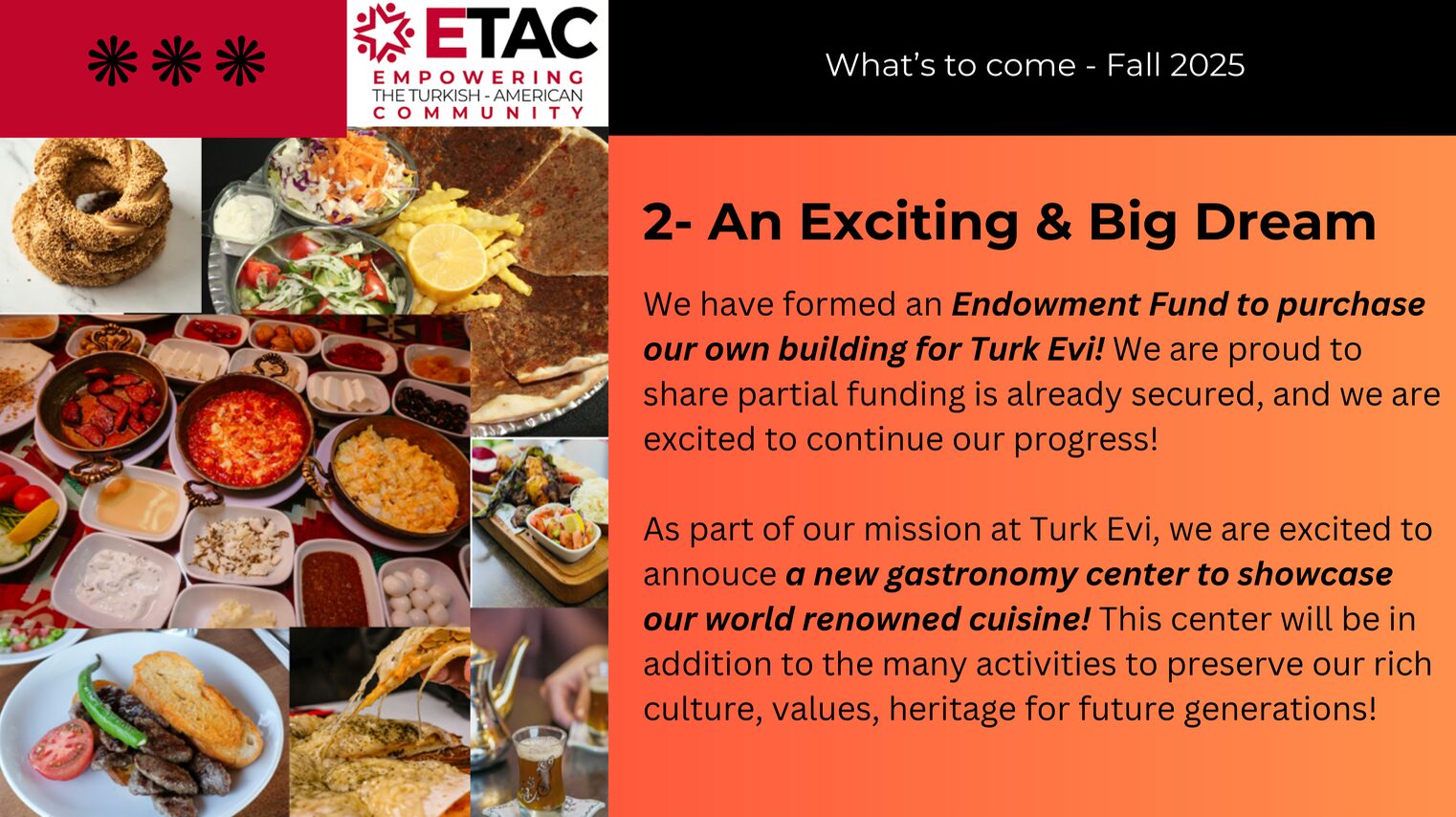 We are proud to have created the first Turkish-American Community Center, "Turk Evi," in the Bay Area to host programming and events aimed at preserving the rich culture, values, heritage and world-renowned cuisine of Turkiye, alongside professional development and community enrichment events.